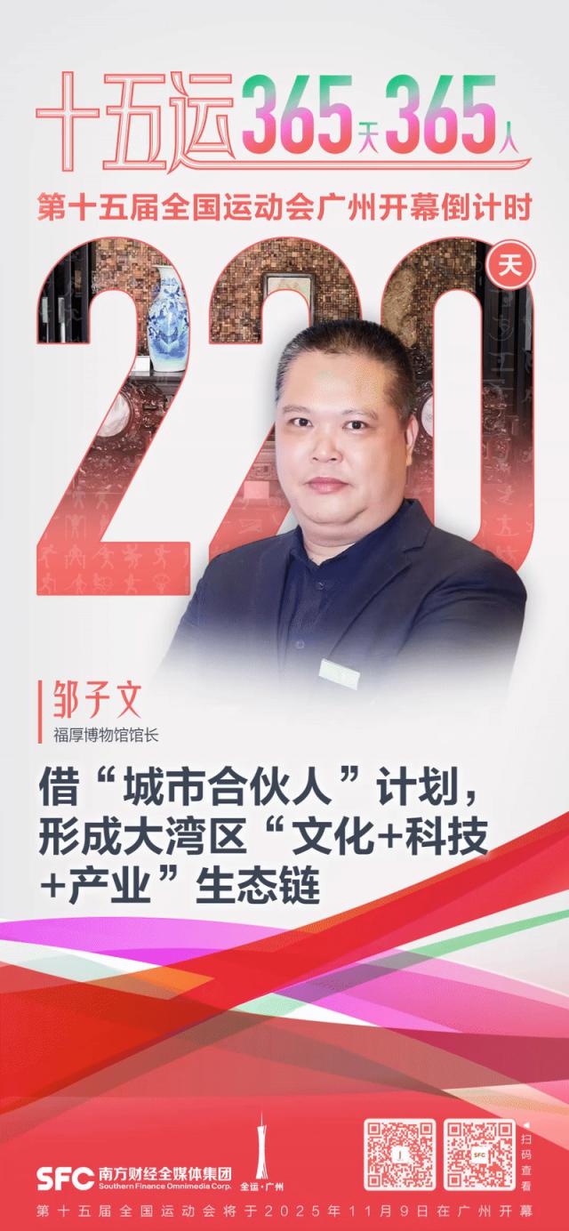 第十五届全国运动会将在 2025 年 11 月份在粤港澳三地举行。它是一项体育赛事,也是促进全民健身、促进体育事业高质量发展的重要机遇。在十五运会开幕倒计时一周年之际,南方财经全媒体集团与十五运会、残特奥会广州赛区执委会推出“十五运会” 365 天 365 “人”栏目聚焦选手、企业家、专家学者、体育爱好者、公众的全运故事和全运期待,让更多人了解和支持十五运,生动展现中国的体育精神、城市活力和文化魅力。