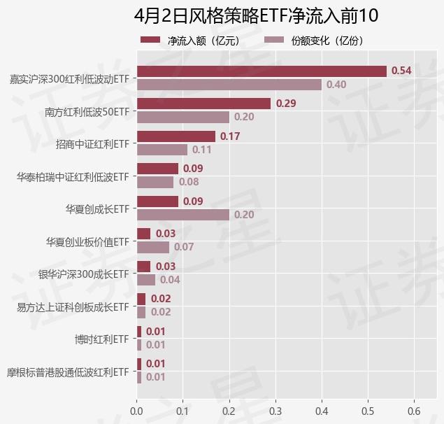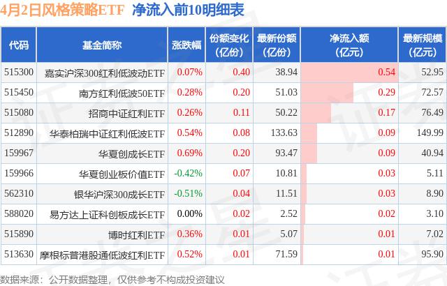 当天有 11 只风格策略 ETF 基金出现净资金流入,其中嘉实沪深净流入排名第一。 300 收益低起伏 ETF(515300),份额增加 3950.0 万份,净流入额为 5371.04 万元。
