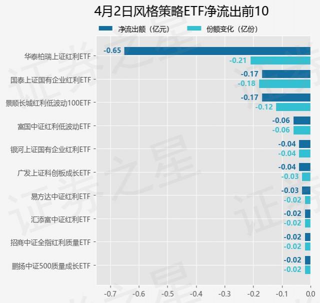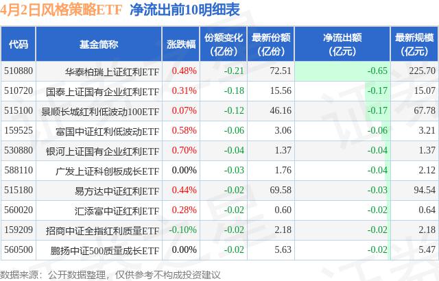 当天有 19 只风格策略 ETF 资金净流出,其中华泰柏瑞上证红利排名第一。 ETF(510880),份额下降 2100.0 万份,净流出额为 6529.75 万元。