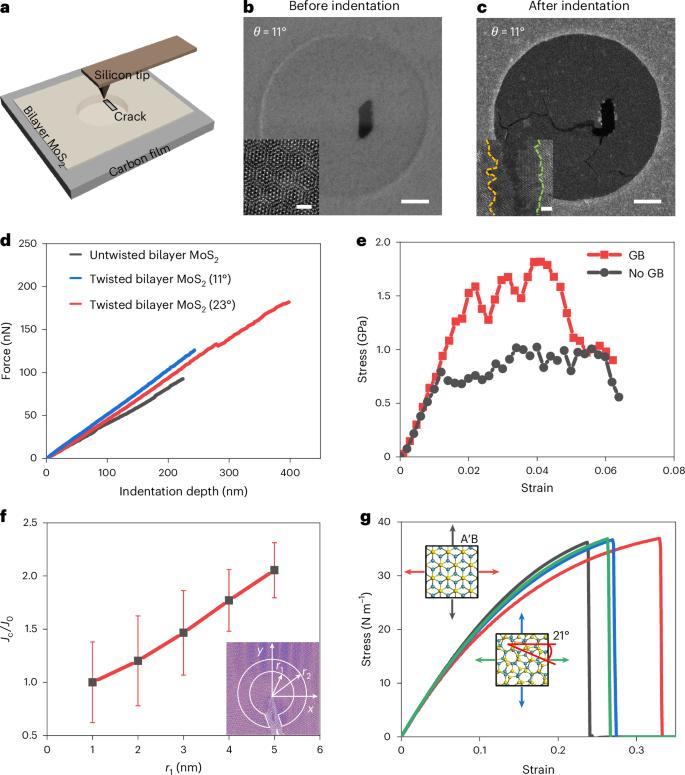 (2)试验通过原点球差校准透射电子显微镜、纳米压痕试验和理论分析,揭示了扭转双层结构可以促进裂缝边缘的自发愈合,形成稳定的晶体边界,从而提高韧性。