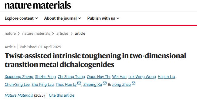 鉴于此,香港理工大学赵炯教授、清华大学徐志平教授与香港城市大学李淑惠教授合作。Nature Materials在期刊上发表了一篇名为“”的杂志Twist-assisted intrinsic toughening in two-dimensional transition metal dichalcogenides"最新论文。这个团队设计和制备了两层过渡金属硫化物(MoS2)、WS2)结构,成功地提高了二维材料的冲击韧性。这个团队设计和制备了两层过渡金属硫化物(MoS2)、WS2)结构成功提高了二维材料的冲击韧性。研究人员扫描透射电子显微镜的原点(STEM)、纳米压痕试验与理论分析,揭示了两层TMDs设备在断裂过程中歪曲的独特自愈机制。