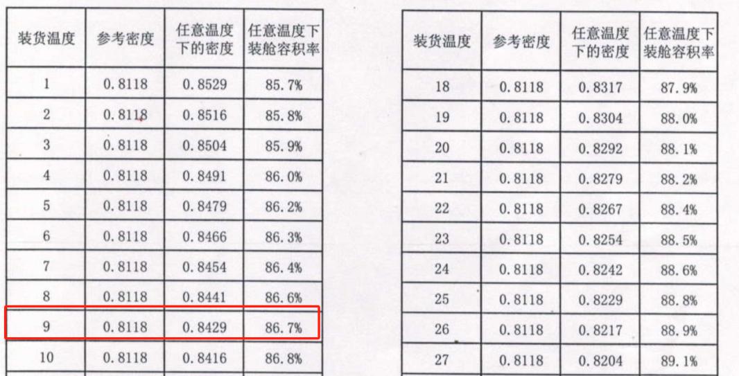 经典案例:中国国际航行化学品船从国内装载环氧丙烷到珠海高栏港卸货。根据CCS批准的《环氧丙烷装卸操作手册》(如下图所示),本轮航次装载温度为9℃,装载温度(9℃)下衣舱容积率不得超过86.7%。经核实,本轮航次8个货舱的实际装载容积率均超过86.7%。