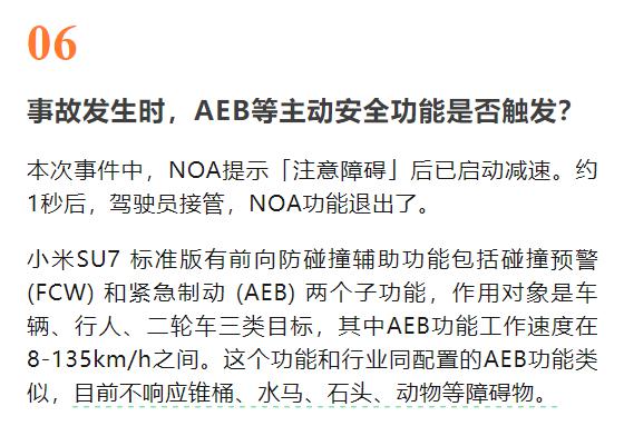 3 月 29 日夜,一辆小米 SU7 专业版在 NOA 当它打开时,它被驱动到一个施工路段。这条路用路桩封闭了这条车道,改变了线路到对面车道。但是车没有回过神来,撞上了隔离栏的水泥桩,然后着火了。