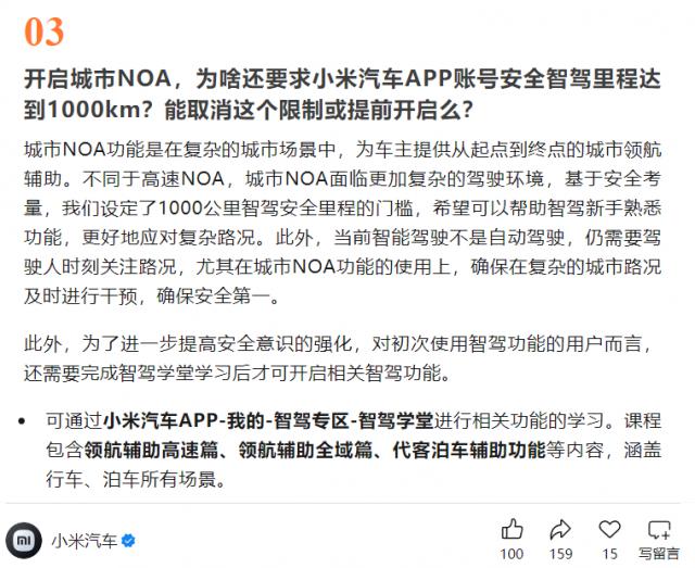 举例来说,在乐道车上,你应该使用它。 100 公里高速智能驾驶后,城市智能驾驶可以解锁。小米要求更高,需要高速。 NOA 里程达到 1000 公里才行。
