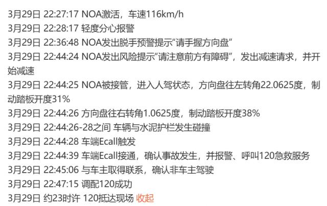昨天小米发布了一些信息:车辆在碰撞前行驶 NOA,车速是 116km/h,在 22:44:24,NOA 发出风险提示,开始减速;接下来的两秒钟,NOA 接管后,刹车踏板被踩下;但是由于刹车距离不够, 22:44:26-28 车辆与水泥护栏发生碰撞,最终可确认撞击前系统的速度约为 97km/h。