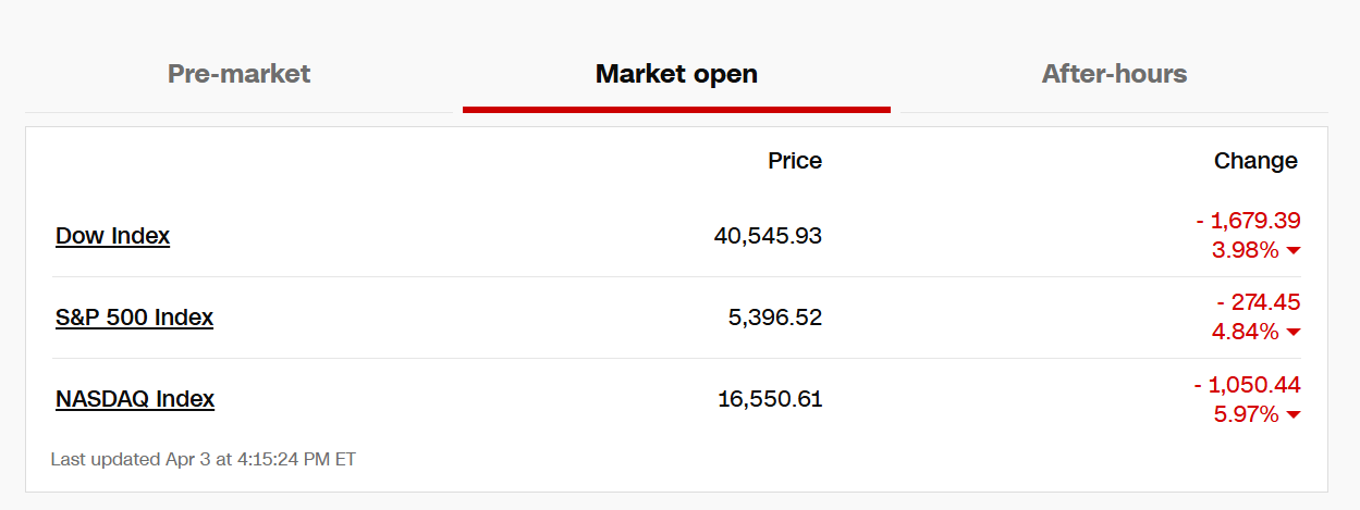 自残关税屠杀美股,三大股指创下近五年最大单日跌幅