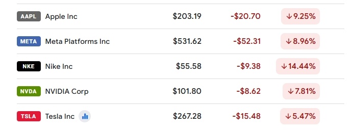 在个股方面,跨国公司的股票下跌尤为明显,其中耐克和苹果跌幅超过14%和9%。;科技股也普遍下跌,英伟达下跌近8%,特斯拉下跌超过5%,Meta下跌近9%。