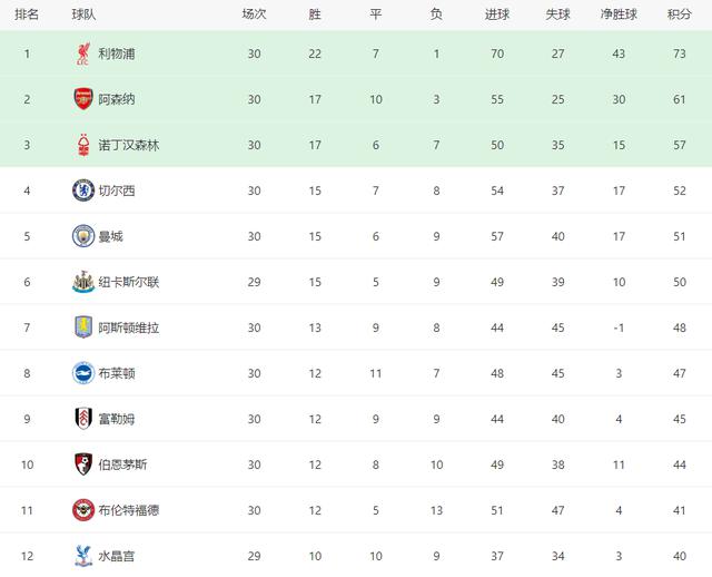 在夺冠悬念不大的情况下,欧冠席位的争夺是本赛季英超最大的亮点;目前英超在欧战中遥遥领先,获得第一名的概率很大。 5 一个欧冠席位。阿森纳 61 分排在第 在击败曼联之后,诺丁汉森林进一步巩固了欧冠席位,57 分排在第 3。在这一轮,切尔西依靠恩佐的进球成功地杀死了热刺,54。 分排在了第 四是占据主导地位。
