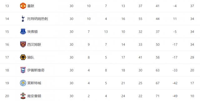 切尔西落后曼城 1 分排在了第 5 位置,纽卡 50 分排在第 6;第 7 的维拉和第 8 布莱顿各自也有 48 分和 47 分;从第 5 名曼城到第 8 名布莱顿,4 支队伍只差 4 分数;一场胜利就有可能上下排名。已经受伤的哈兰德将缺席 7 一个星期,蓝月亮不仅要保住冠军杯的席位,还要为足总杯冠军而战。对曼联热刺来说,继续排名第一。 13,14 位置,正确的难兄难弟。