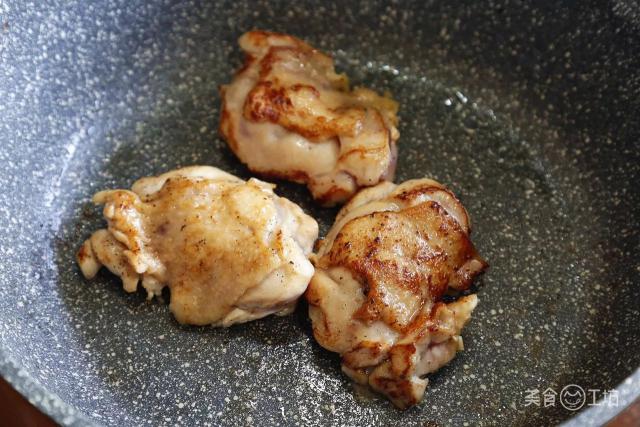 4. 将少量的油放入热锅中,将鸡腿肉有皮的一面向下煎至两面金黄。