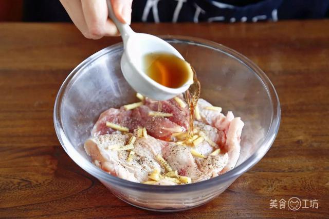 2. 将去骨后的鸡腿肉放入大碗中,倒入一勺米酒,撒上适量的盐、姜丝、胡椒粉,搅拌均匀,腌制半小时左右。