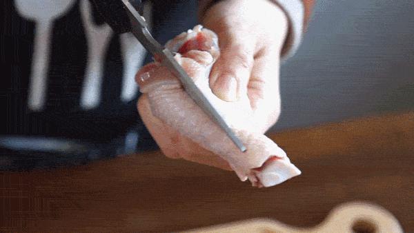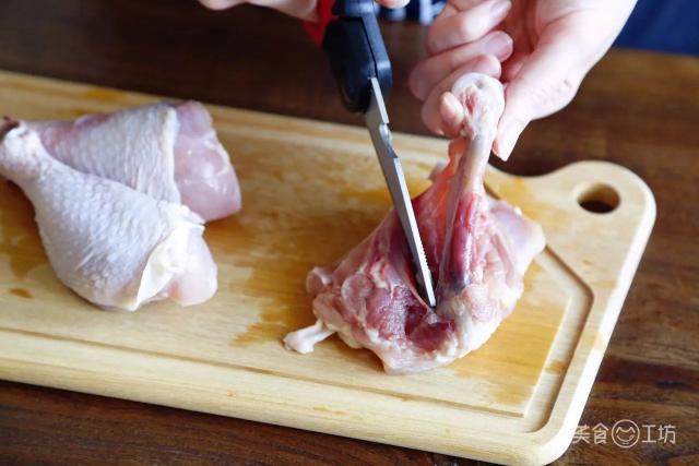 1. 用厨房剪刀剪鸡腿是最方便的处理方法,沿鸡腿间隙一刀剪下。