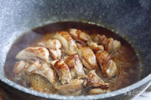 5. 鸡腿炒好后取出,切成每一块带皮的小块,再放入锅中,倒入调好的酱料,用文火煮至酱料颜色粘稠,最后放入锅中。