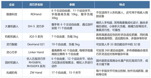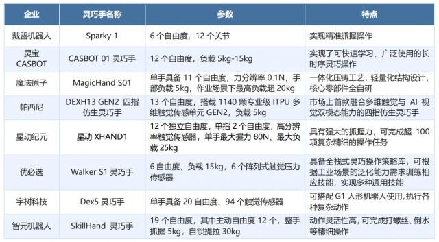图表 4:人形机器人零部件制造商的灵巧手产品概况(不完全统计)