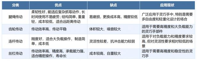 如果按传动装置分类,主要分为腱绳传动、连杆传动、齿轮传动和丝杠传动,其中腱绳传动方案具有重量轻、自由度高的优点,是目前的主流传动方案。但由于不同传动方案的优点不同,不同厂家选择的传动装置技术也不同。同时,一些制造商使用各种传动方案(例如特斯拉 Optimus)。