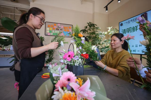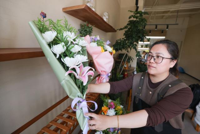 图为“生命花店”,顾客可以亲自为逝者制作花束。/ 报告记者袁婧摄