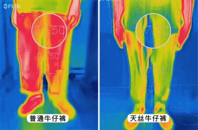使用热成像仪检测:穿上天丝牛仔裤后可以迅速降低体表温度,比普通牛仔裤要凉爽得多。