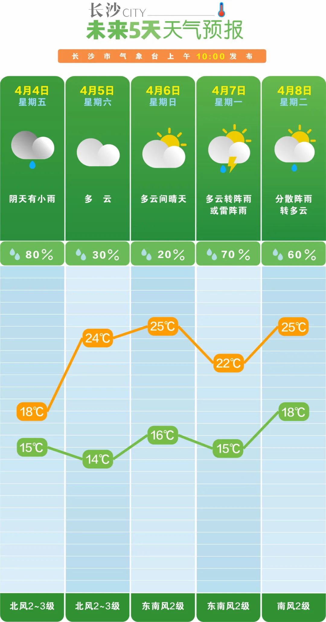 长沙气象台预计:今天,阴天有小雨,15~18℃;五日至七日,白天以阴天或晴天为主;七日晚至八日,受高空波动影响,有阵雨;九日至十日晴天多云。