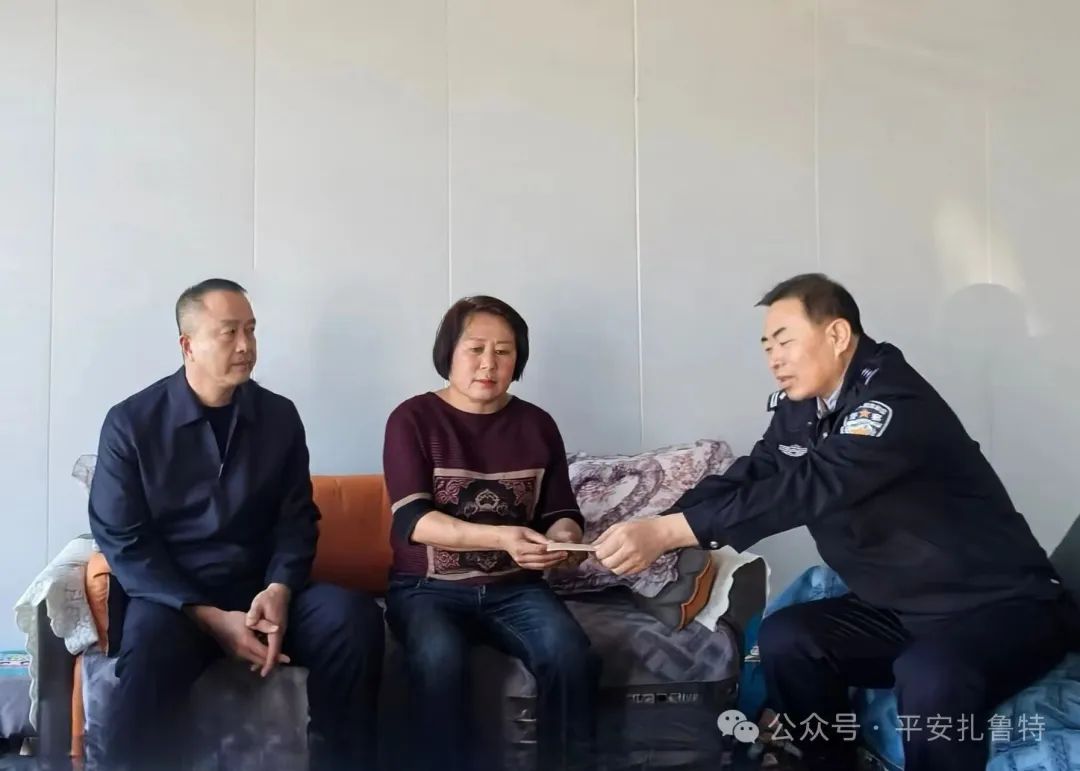 四月二日,扎鲁特旗公安局走访慰问因公殉职伍拾柒、石光宇家属。与家人亲切交谈,详细询问他们的身体状况、生活状况和困难,深刻缅怀因公殉职民警为维护社会稳定和保障人民安全做出的牺牲,感谢家人对公安工作的理解和支持。与此同时,给家人送上慰问金,告诉他们要注意身体,引导他们保持积极的生活态度。