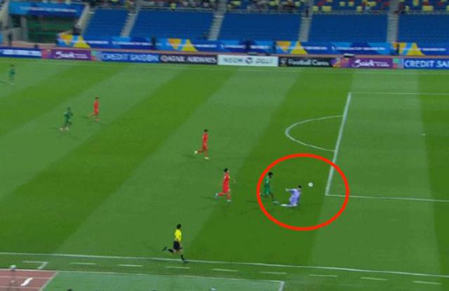 第一次失球发生在第一次 11 分钟。前场,姚俊宇断球后没有及时射门,被对手反击。沙特随后反击,后场长传,寻找前场球员。这个球没有威胁,因为沙特前峰马塔里在右边的路前插入,距离球门还有很长的路要走。