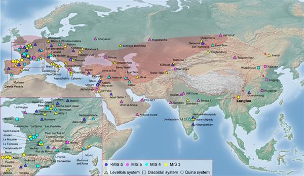 欧亚大陆旧石器时代中期不同技术类型的遗址布局:三角形代表勒瓦娄哇技术类型的遗址、方形代表盘技术类型的遗址、圆形代表基纳技术类型的遗址。