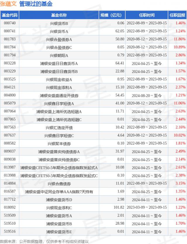 张蕴文女:中国国藉,澳洲科廷大学金融硕士。2011 年 4 月至 2014 年 11 每月在瑞穗银行苏州分行和瑞穗银行总行金融市场部担任资金交易员。2014 年 11 月至 2016 年 12 每月在东方证券股份有限公司资金管理总部担任流动性资产投资经理。2017 年 1 月至 2023 年 9 每月在兴银基金管理有限公司固定收益部工作,曾担任宏观研究员、信用研究员、基金经理助理、基金经理。2023 年 9 从月开始加入浦银安盛基金管理有限公司,担任固定收益投资部基金经理。2024 年 4 月 11 日任浦银安盛金融市场证券投资基金基金主管。2024 年 4 月 25 任浦银安盛中证同业存单 AAA 指数 7 天持证券投资基金主管、浦银安盛日鑫金融市场基金主管、浦银安盛日鑫金融市场基金主管 CFETS0-5 央企债券指数发起式证券投资基金主管、浦银安盛上海清算所短期融资指数证券投资基金主管、浦银安盛普庆纯债券证券投资基金主管。2024 年 8 月 20 日本担任浦银安盛通债券型发起式证券投资基金基金主管。