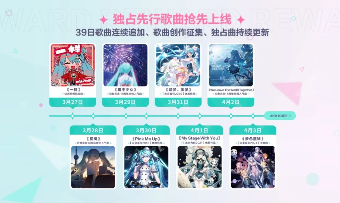 官方此前曾宣布,包括独占曲目在内的简中服将从上线当天开始,连续39天向游戏增加新曲目。“39”发音和“39”在日语中ミク(Miku)”以及“Thank You“类似的,早期的初音也将在每年的3月9日举行,以此为契机,感谢节演唱会。此外,初音未来官方生日日期(8月31日)的结果也是39,这对于整个IP策划和粉丝来说无疑具有非常特殊的意义。