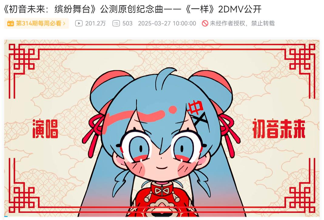 但是在上线之前,运营团队还邀请了mikitoPitoPito,让《初音未来:多彩舞台》第一次测试的消息在观众中充分传播。、Mes等Vocaloid圈的知名P主(创作者)为《初音未来:五彩缤纷的舞台》设计了第一首原创纪念曲《一样》。发布不到一周,哔哩哔哩音乐MV的播放量就超过了200万,一度位居全站热榜前11。