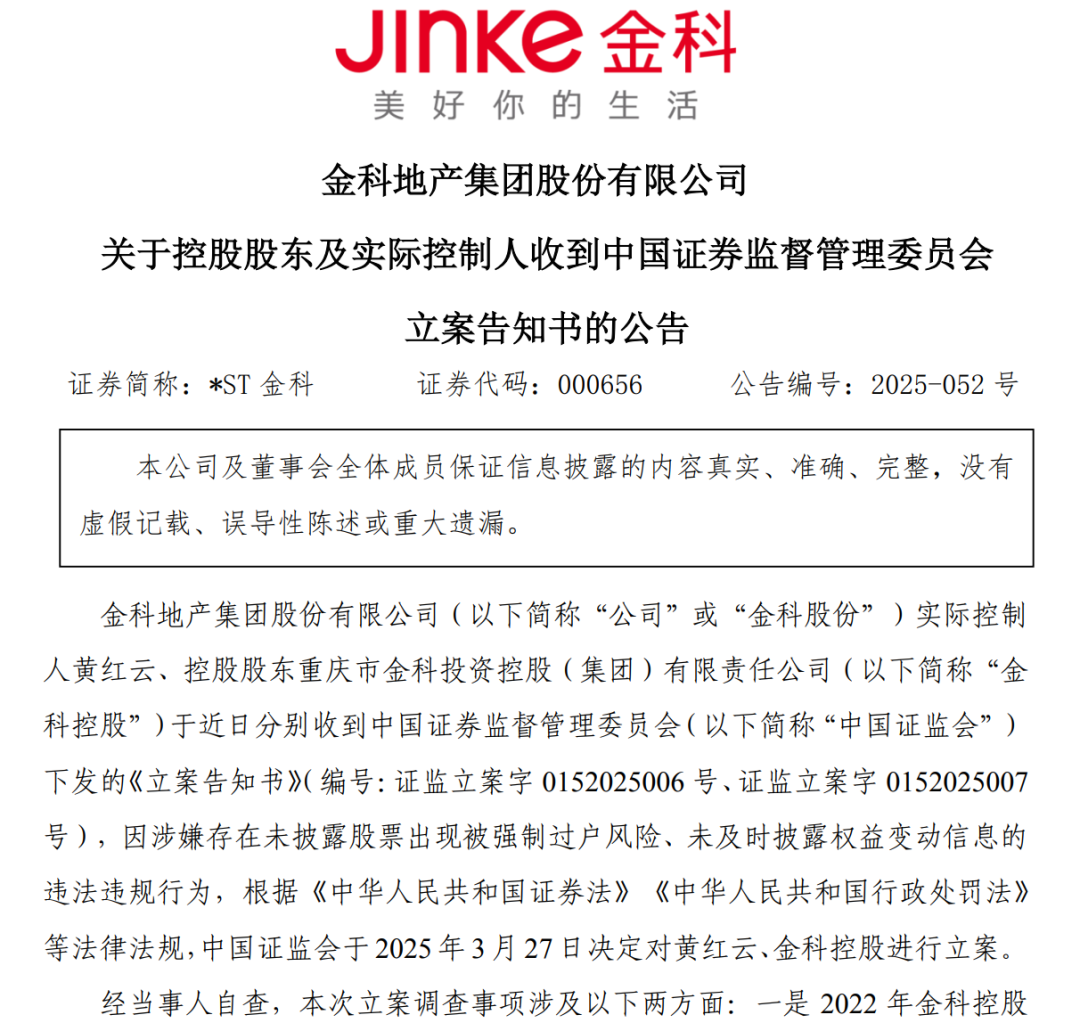 4月3日晚,金科股权(即*ST金科:SZ000656)宣布,公司实际控制人黄红云、控股股东重庆金科投资控股(集团)有限公司(以下简称金科控股)近日收到中国证监会发布的《立案通知书》,涉嫌存在强制转让股票风险、权益变动数据未及时披露的违法行为。2025年3月27日,中国证监会决定立案黄红云、金科控股。