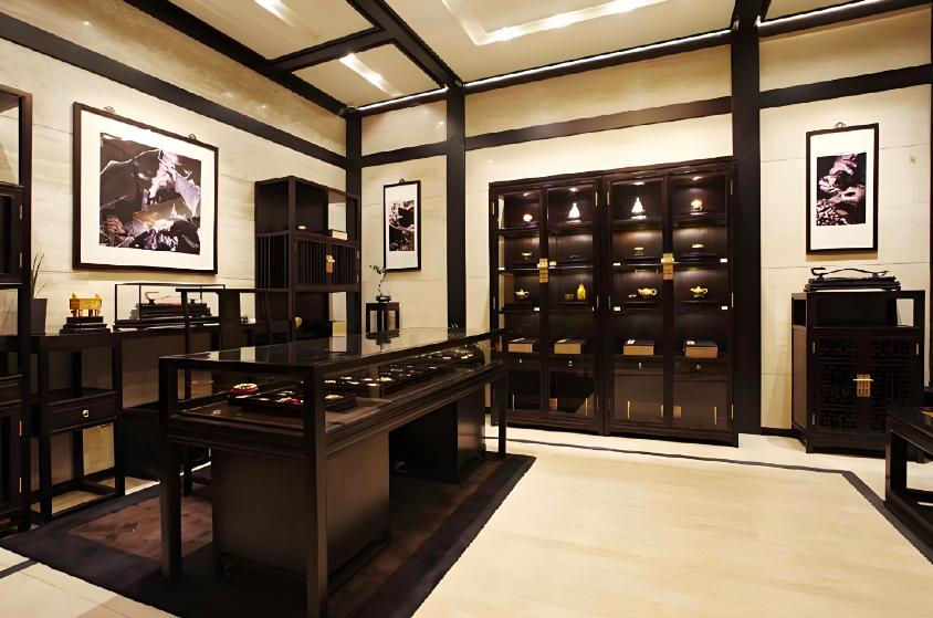 更巧妙的是店面场景的制作,明式书房风格的展示柜,3000K色温的定制灯,甚至试穿时提供的依云矿泉水和歌帝梵巧克力,都在加强“奢侈品感”。一位客户在社交平台上写道:“在这里买金饰,就像收藏故宫文物一样。”