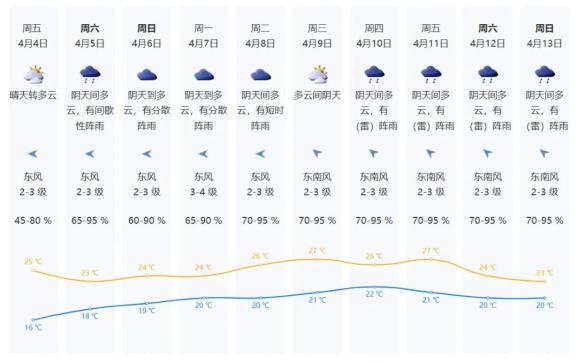 四月四日,晴天转多云;气温16-25℃;东风2-3级,相对湿度为45%-80%。