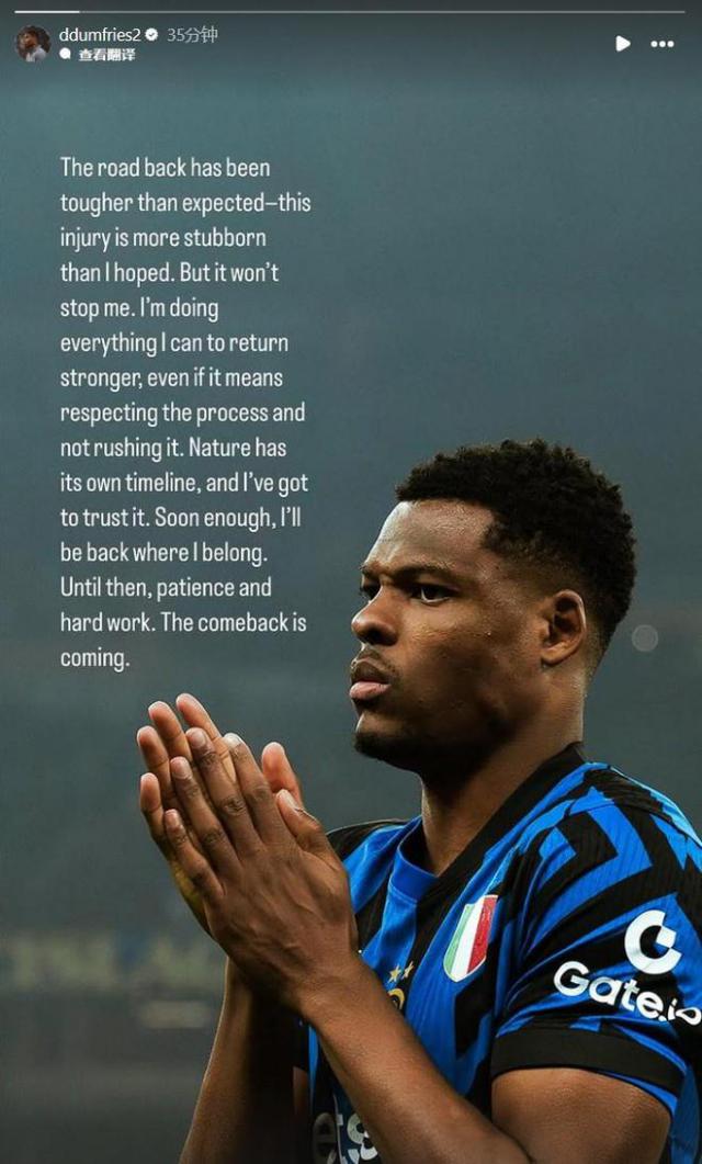 邓弗里斯写道:“康复比预期的更难——这种伤比我预期的更顽固。但它不会阻止我。我正在努力以更强的姿态回归,即使这意味着我们必须尊重恢复过程,而不是急功近利。”