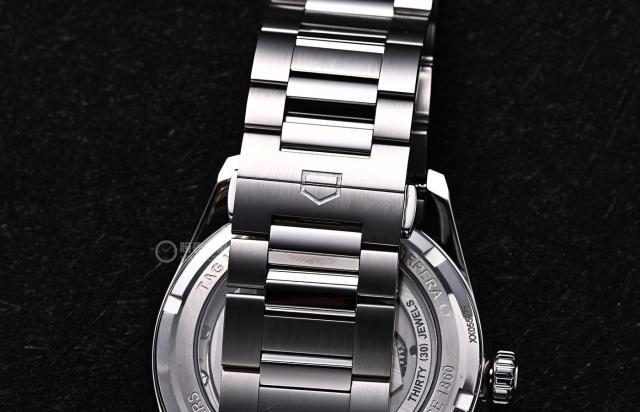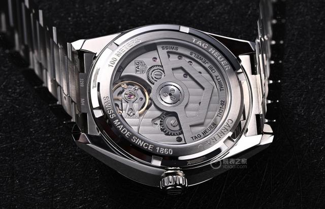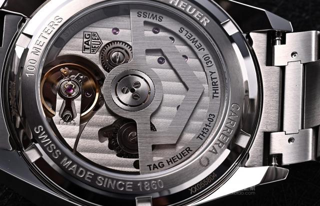旋转式手表,背透式设计让我们能把它放在里面。 TH31-02 自动化机械机芯一览无余,盾形摆陀,精心打磨,都展现了泰格豪雅的精湛工艺。值得注意的是,这并非传统意义上的“统芯”,而是泰格豪雅和泰格豪雅。 AMT 共同研发,专为泰格豪雅生产,拥有近乎 80 一小时的动力储备,并且享有可以延长到五年的保修服务,可见泰格豪雅对它有着十足的信心。