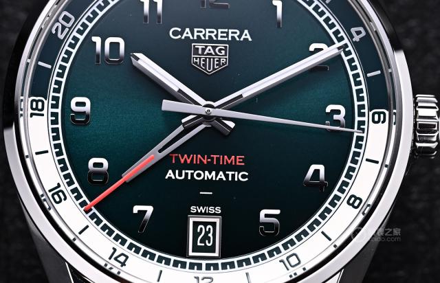 红色两地时(GMT)指针的尖端从泰格豪雅卡莱拉系列的手表中汲取灵感,来自品牌传世收藏,向手表欣赏者低调致敬。它的造型巧妙地呼应了手表制造工具的优异精度,比如手表制造商手中的镊子,在绿色的盘面上极其显眼。