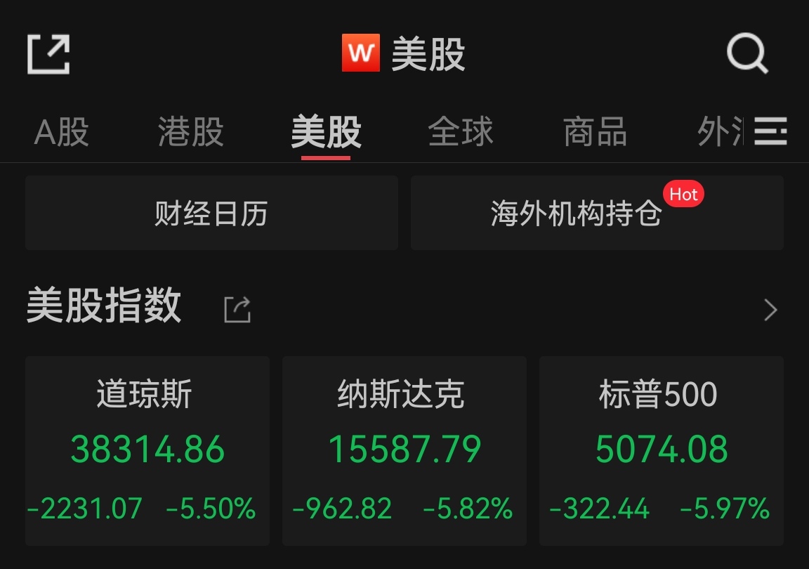 截至收盘,道指下跌5.5%,报38314.86点,低于历史最高收盘纪录的10%,确定进入调整范围;标准普尔500指数下跌5.97%,报5074.08点,创2020年3月至今最大单日下跌;纳指下跌5.82%,报15587.79点,低于历史最高收盘纪录的20%以上,确定进入技术熊市区间。本周,道指下跌7.82%,标普500指数下跌9.08%,纳指下跌10.02%。