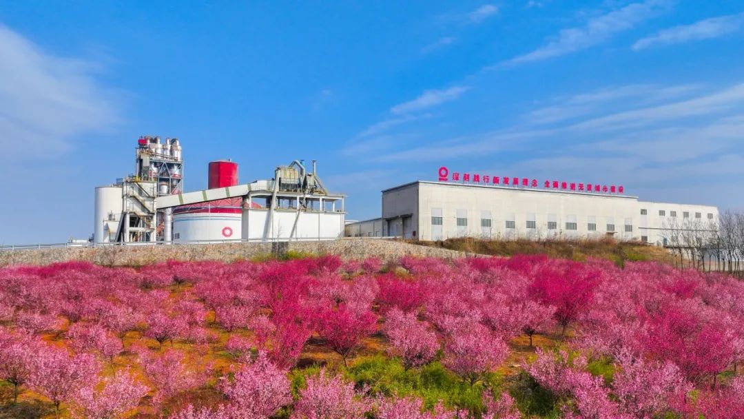 高岭土企业阳光肆意,桃花燃烧,绿枝摇曳。