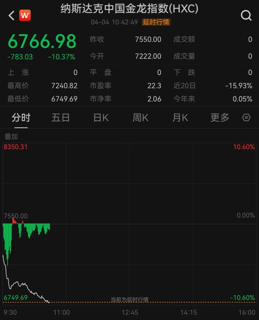 受美股普遍暴跌的影响,中国证券交易所普遍下跌。截至22:纳斯达克中国金龙指数跌幅超过10%。