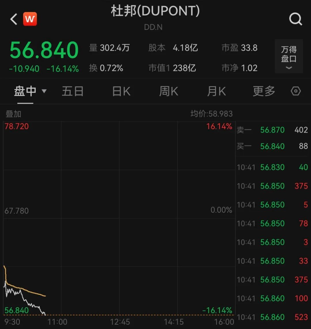 个股方面,杜邦股价在开盘后继续大幅下跌,截至北京时间22:杜邦跌破了41%以上。