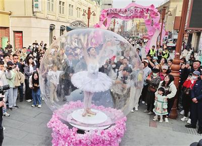 在和平的道路上,《海棠八音盒》的机械装置艺术表演正在上演,特制的大型水晶球八音盒正在慢慢打开,海棠花瓣漂浮在水晶球中,里面的芭蕾舞演员随着八音盒的节奏轻盈旋转,如梦如幻。