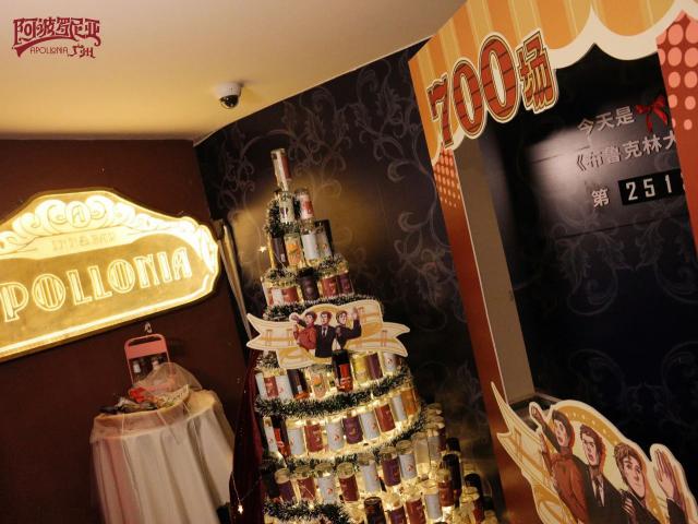 图为《阿波罗尼亚》广州馆开业一周年之际,卡司回归现场时带来了粤语版的音乐《爱》。这种每个周年纪念日策划的鸡蛋在当时引起了当地的热烈反响。“其实在不同的城市表演的时候,我们会在台词里加一些当地的方言,每次都能得到观众的良好互动。”