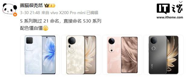 IT 世家 4 月 4 每日新闻,博主 @熊猫很秃然 最近爆料说,vivo S 绕过系列手机 21 命名,直接命名 S30 系列。这位博主还晒出了蓝色、金色、粉色、黑色四种配色方案,并称“配色懂得自理”。博主还没有透露这款新机的具体规格。