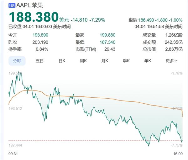 根据财联社的统计,苹果企业在这一波下跌中损失最大,这家科技巨头的市值下降 4159 亿美元,已经不足了 3 亿美元。