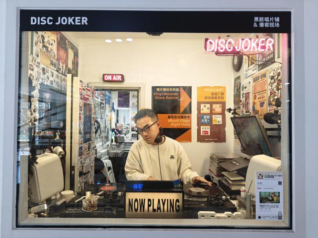 站在" DISC JOKER 迪士乔克“店前,隔着那边干净的玻璃窗,可以让很多老广回忆起广州地铁烈士陵园站前线电台广播《天生幸福人》的录播间。如今,播客《小房间》的经理是在玻璃后低头“打碟”的。 Trace(屈伟斌)。