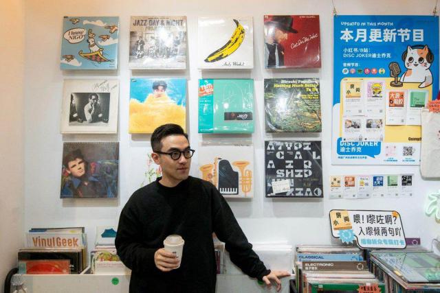 " DISC JOKER 没有复杂装修的迪士乔克,12 平方米的小空间可以说是完全被唱片“包围”了,店面向外展出。 Trace 精心挑选的唱片展览,里面整齐地摆放着各种唱片,门口还贴着“会说粤语”的提示。玻璃后面,五颜六色的唱片封面拼在一起。 Trace 丰富心灵的一角。“我把店铺设计成四周的玻璃窗,只是希望我们的店铺尽可能的开放,尽可能的呈现出轻松的氛围,让大家看到后愿意进来。"
