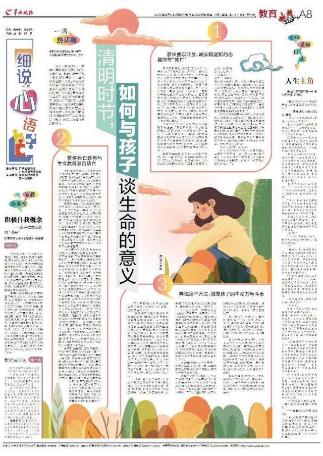 “无论什么年龄,和孩子讨论死亡都要注意三个维度:一是从客观科学的角度解释事实层面的死亡;第二,在情感层面,接受面对死亡时的负面情绪和感受;第三,价值维度,无论生命是否会结束,无论死亡何时到来,生命都有自己的意义。“李繁玲强调,死亡教育和生命教育不仅存在于一次谈话中,也存在于一个长期的过程中。父母可以充分利用现实生活中的适当时机,与孩子开始对话。比如在清明节等纪念日,可以带孩子去扫墓或者参加庆祝活动,让孩子在这个过程中感受到生命的轮回和对逝者的尊重;当你身边有亲人或朋友去世时,父母可以和孩子一起回忆逝者的美好,表达对生命的敬畏;当发生重大公共安全事件时,可以向孩子强调生命的珍贵,教会他们思考如何帮助受灾群体,学会关爱生命;当家庭一起旅行时,我们可以带孩子观察大自然中的动植物,感受他们生活的变化。一棵大树生长、盛开、结果。秋天,枯叶相当于死亡的一部分。然而,当落叶落下时,它会滋润树根,使树长得更好。这是一个无尽的生命过程;父母和孩子可以一起看相关的绘本和电影,在渗透生命教育的同时和孩子讨论绘本或电影内容。