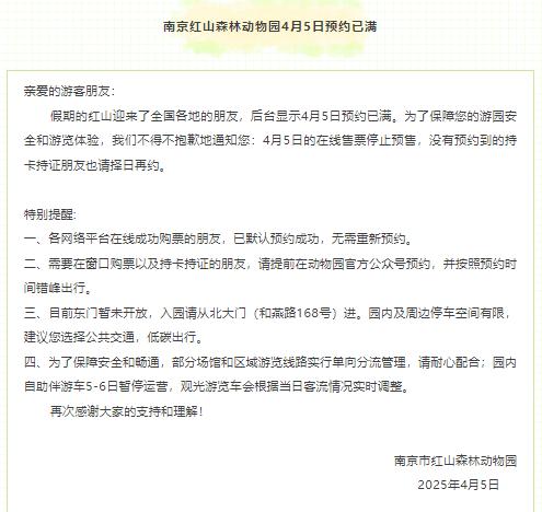 4 月 5 日本,南京红山森林动物园发布通知,4 月 5 日常预约已满,全文如下: