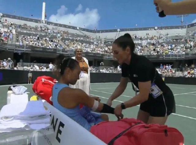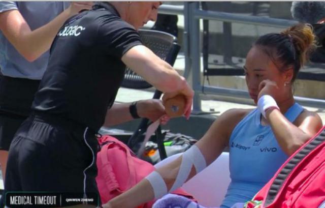 第二盘,郑钦文还是找不到状态,上去就破了。 3 郑钦文在比赛结束后 1-2 落后。这时,她申请暂停医疗,要求医护人员为她治疗肘部损伤。这时,粉丝们才知道郑钦文今天状态大幅下滑的主要原因。 -- 这是一场带伤的战斗。