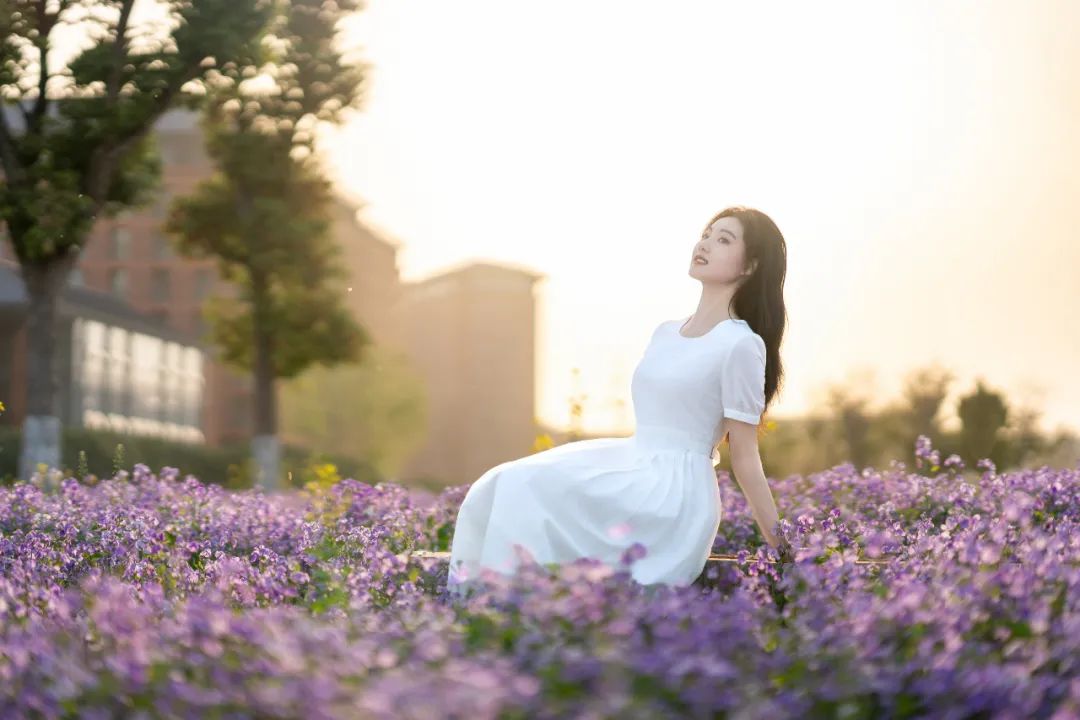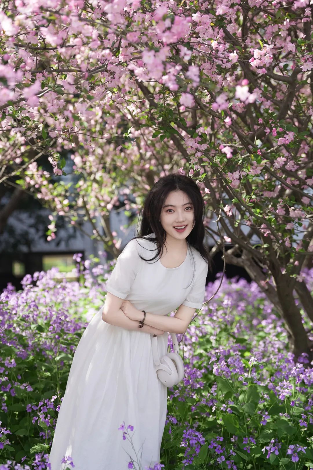 巧妙地拍摄了海棠和二月兰同框的浪漫美感。