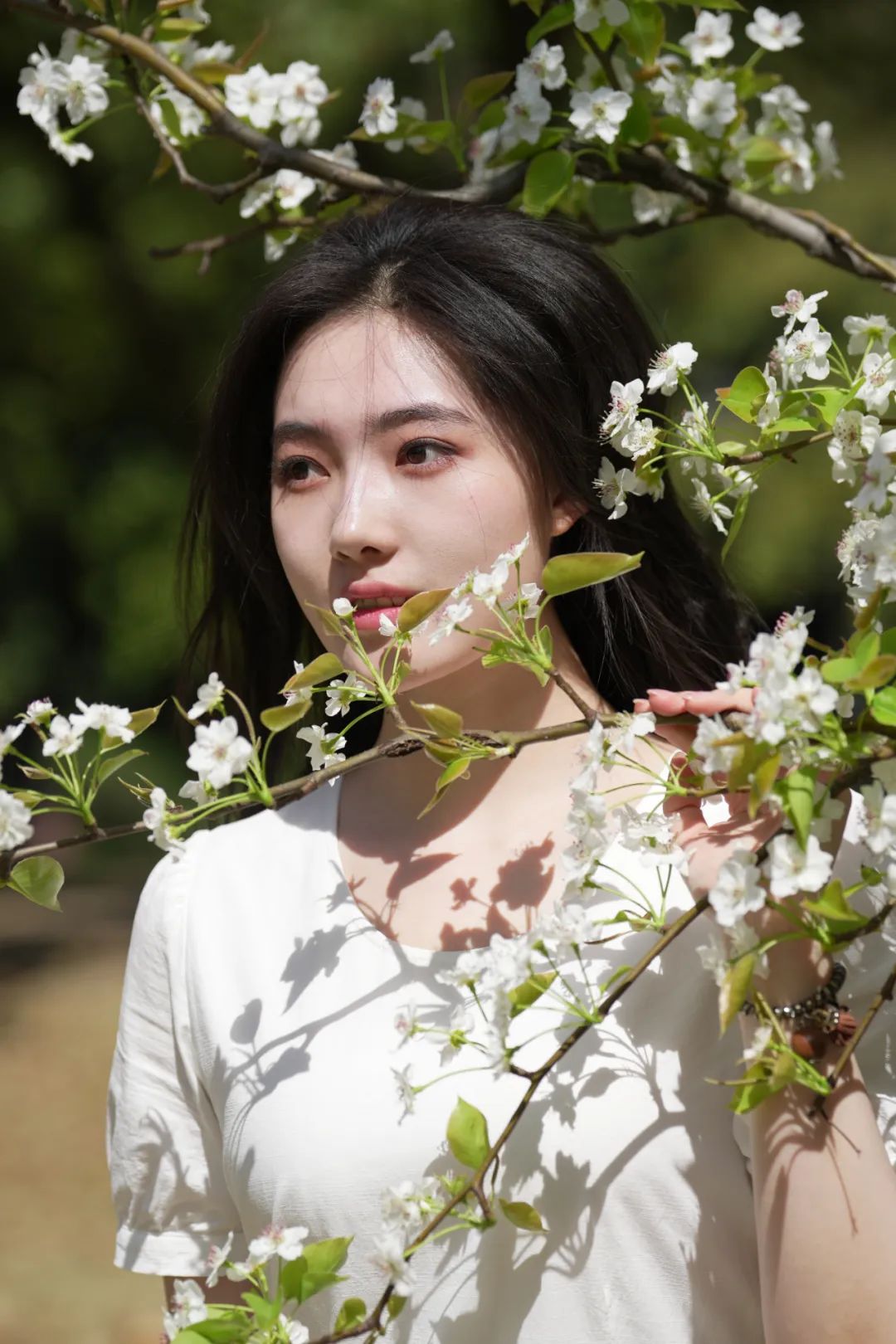用手轻轻扶着枝叶,眼睛自然向前看。