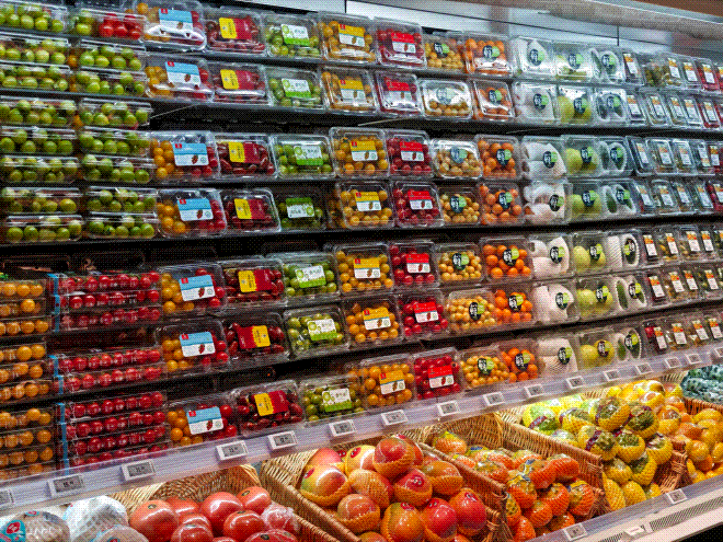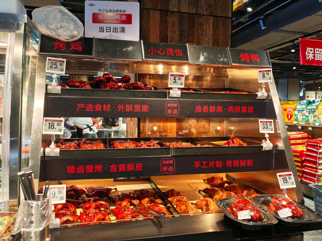 新鲜食品方面,店面在商品质量和品类丰富度方面进一步优化提升。肉禽板块引入优质黑猪肉、贵州小黄牛等品类;水果板块增强了水果钓鱼、果汁、果茶等品类;蔬菜板块,为了保证安全卫生,蔬菜叶、豆制品、分切菜都是在低温柜里精包出售;水产品板块也大大丰富了品类,从新西兰玉鲍到红蟹、皇蟹、大红龙虾。